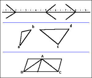 1. Сравнивая две фигуры, из которых одна действительно меньше другой, мы ошибочно воспринимаем все части меньшей фигуры меньшими, а все части большой - большими ("раз целое больше, тогда больше и его отдельные части"). Это хорошо видно, скажем, на примере с линейкой: левый отрезок на ней кажется нам чуть длиннее правого, хотя на самом деле они равны. Это обуславливается психологическим аспектом восприятия. На двух других рисунках правые фигуры больше левых (фигуры в целом), однако отмеченные буквами части этих фигур равны отмеченным буквами частям левых фигур, хотя они и кажутся значительно крупнее. Это происходит потому, что свойства фигуры мы ошибочно переносим на ее части.