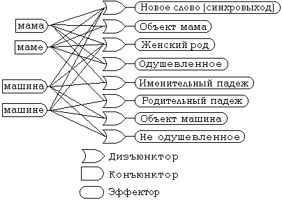 В представленной сети не хватает функций определения типов или классов объектов, таких как "существительное", "мужской род", "женский род" и других, аналогичных. Функции определения типов объектов легко реализуются с помощью агрегирующего подслоя, состоящего из несинхронизированных нейронов, выполняющих функции дизъюнкции и, при необходимости, инверсии (рис.2).