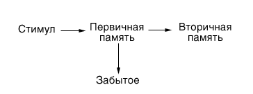 Одна из первых и наиболее часто упоминаемых когнитивных моделей касается памяти. В 1890 году Джеймс расширил понятие памяти, разделив ее на "первичную" и "вторичную" память. Он предполагал, что первичная память имеет дело с происшедшими событиями, а вторичная память - с постоянными, "неразрушимыми" следами опыта. Эта модель выглядела так: